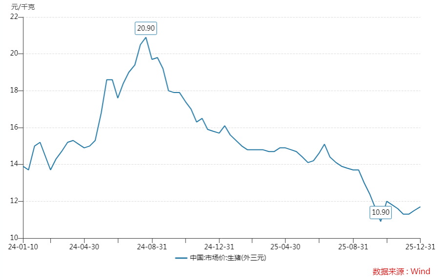 国家统计局数据显示,2025年上半年,生猪(外三元)市场价始终保持在14元/kg以上,9月中旬开始则出现一轮显著下跌,到10月中旬时最低跌至10.9元/kg,此后两个月也一直保持在12元/kg以下的相对低位运行。