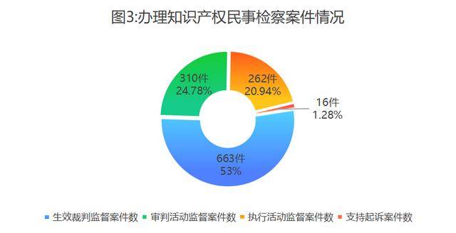 各级检察机关办理知识产权民事检察案件1251件。其中,民事生效裁判监督案件663件,民事审判活动监督案件310件,民事执行活动监督案件262件,民事支持起诉案件16件。