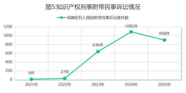 4.推进知识产权刑事附带民事诉讼。起诉的侵犯知识产权犯罪案件中,保障权利人提起附带民事诉讼898件,占比9.8%,有效降低维权成本,减轻权利人诉累。